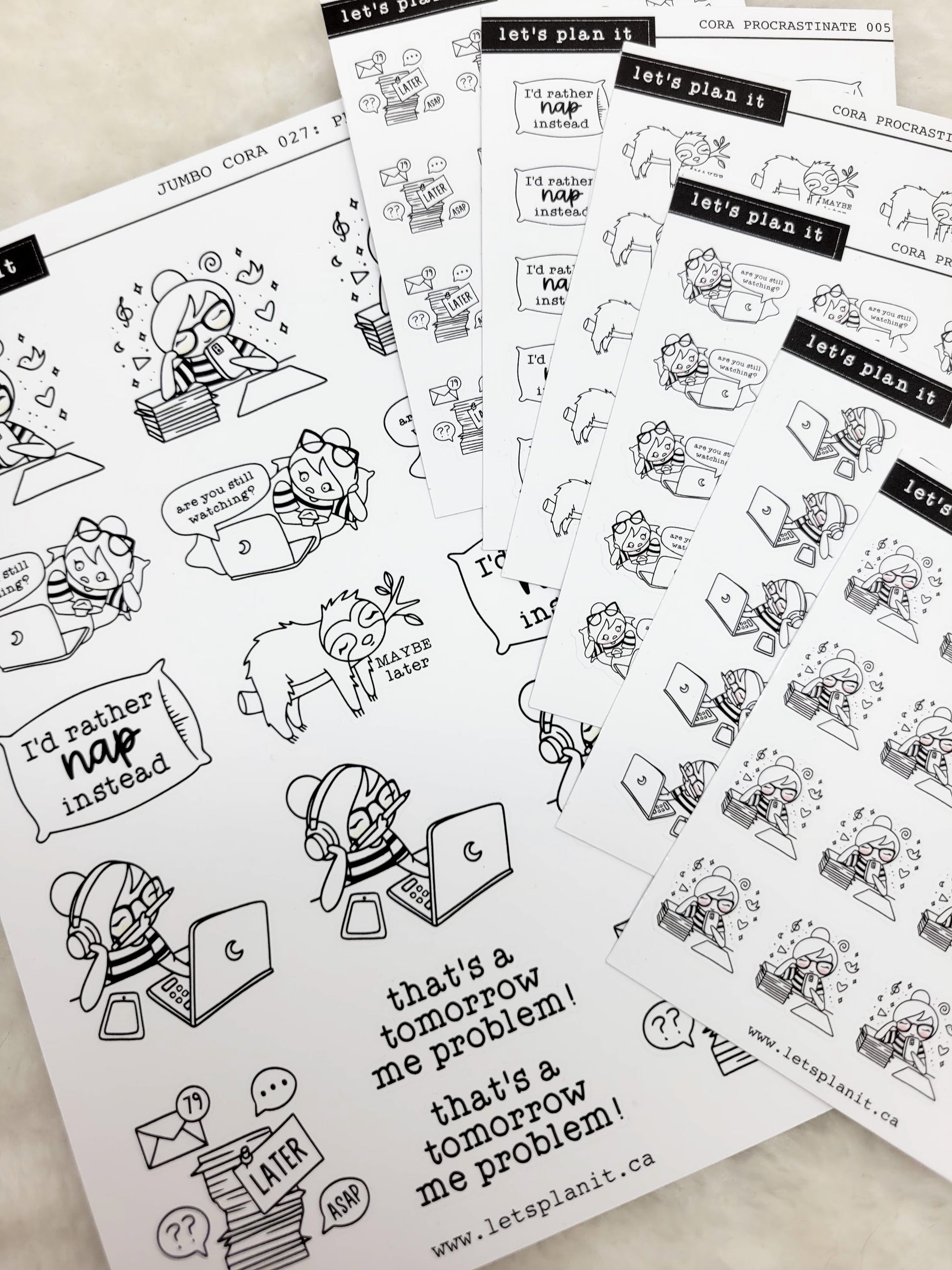 Meet Cora, this spunky lil lady does it all! You can choose jumbo mixed sheets, or you can get a whole sheet of your favourite mini Cora or doodle! Pick the size best suited for your planning space/needs, and colour them to match your needs or leave them monochrome, the choice is yours!